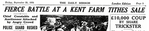 Many smallholders had moved into the countryside after the First World War, when other employment was hard to come by. This new breed of farmer was often not religious and found it shocking that they were required to give substantial sums to support the livings3 of local Anglican clergymen. Small farmers faced with debt and bankruptcy could not pay what they owed Queen Anne’s Bounty. When they could not or would not pay, then bailiffs4 were sent to distrain goods and property to the value of what was owed. These goods were then put up for auction. This happened on numerous farms in East Anglia and elsewhere in the country. However, the farmers soon organised themselves into Associations (as did the clergy and other Tithe-holders). When a farm refused to pay Tithes, there was a distraint auction. Farmers gathered from around to bid for animals and goods at ridiculously low prices. They did this so they could return them to the original farm. In response to this however, Queen Anne’s Bounty took on a tougher approach. They sold animals and goods from Anglia and the south in the north of England. However, so well organised were the farmers that, by 1934, their “passive resistance” was successful. With 8,000 distraint orders waiting to go through the courts they managed to totally clog up the British legal system.